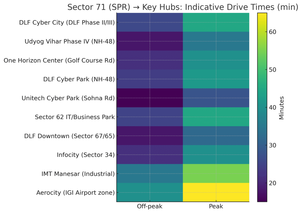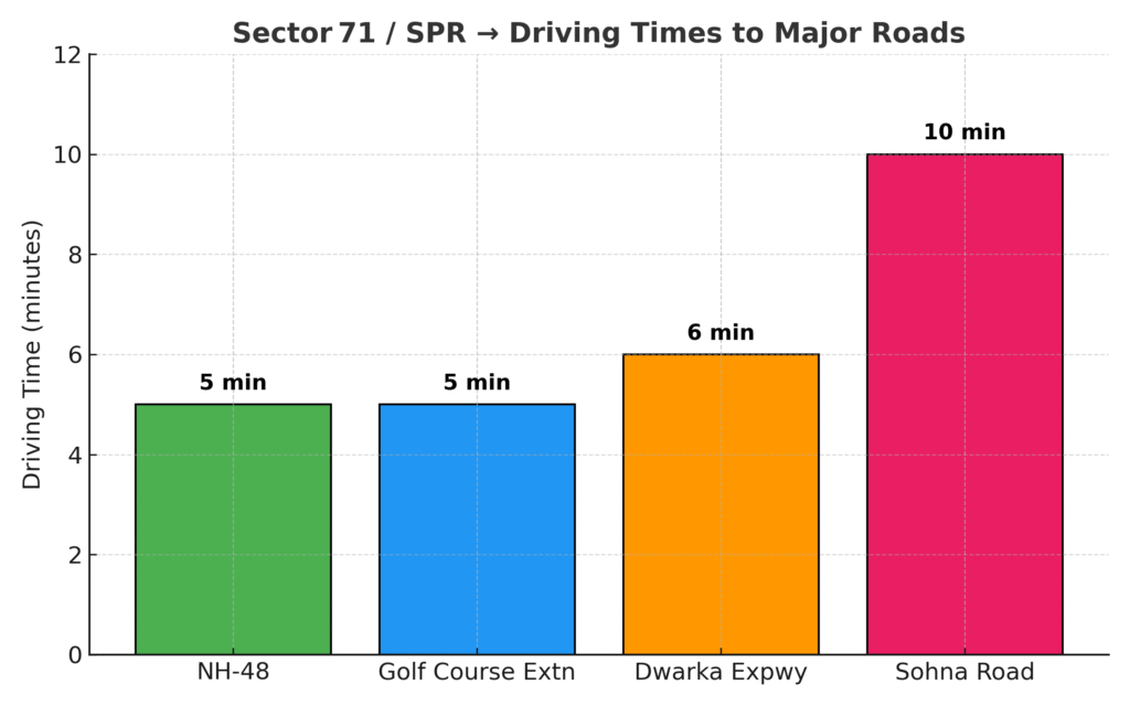 • Sector 71 sits on the SPR itself, bordered by sectors like 72, 73, 70A, etc. It also lies between NH-48, Sohna Road, and Golf Course Extension Road corridors