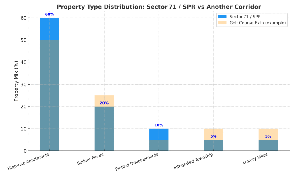 In sector 71/ SPR, the different types of properties are available for sale where ranging from villas, plotted developments, mid rise tower, high rise tower and more, creating a better choice selection for buyers and investors both.